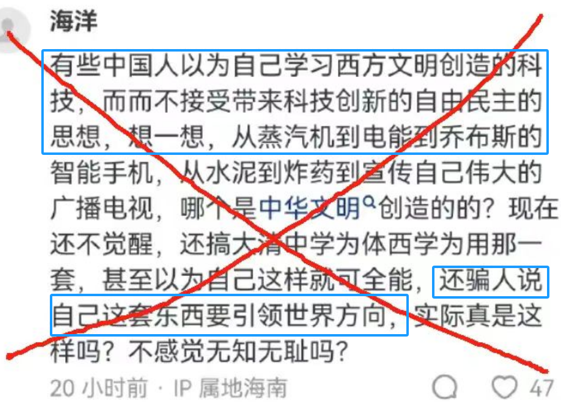 至于所谓的“带来科技创新的(西方)自由民主思想”就更是不知所云了。所谓的西方“自由民主的思想”带来的不是什么科技创新,相反,带来的是殖民,是侵略,是黑奴,与科技创新有什么关系?所谓的“科技创新”无非是为了更好地为殖民服务罢了。西方国家打开殖民地市场的,枪炮之外,不就是科技创新带来的更廉价的倾销商品吗?该不会有傻子认为西方的科技创新是为殖民地服务的吧。