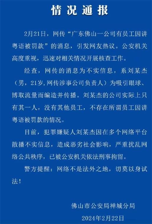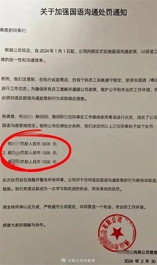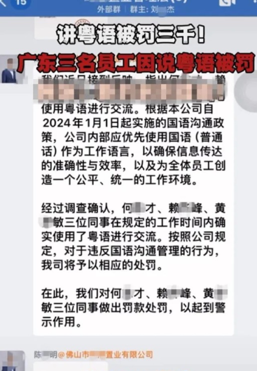 说他们公司的三名员工,因为讲粤语,被罚钱了。