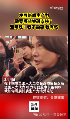 这次人大二次预备会议后,全国人大代表、格力董事长董明珠在回答“发展新质生产力需要哪些金融支持”的问题时,说“金融支持?我不需要,我有钱。”