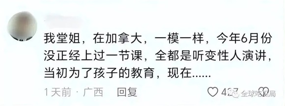 另一名广西网友讲述了自己亲戚的经历:母亲陪孩子去北美读小学,结果发现每天学校就邀请一些变性人来给小学生们上课,还鼓励他们大胆怀疑自己的性别,不要轻易被父母和社会给予的性别所定义。