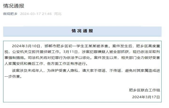 央广网 2024-03-17 河北邯郸市肥乡区初一学生王某某被杀害 涉案犯罪嫌疑人被全部抓获