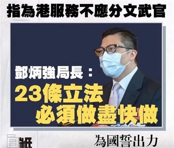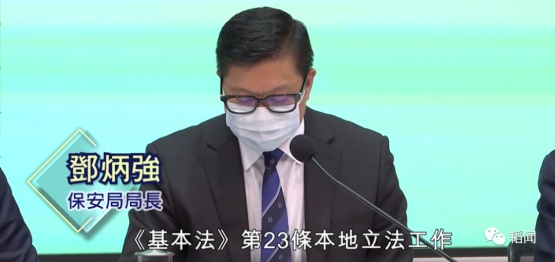 2021年6月27日,新就任保安局长的邓炳强立即就23条立法公开表态:虽然今年来说时间可能不够,可他“会尽力为《基本法》23条本地立法”。
