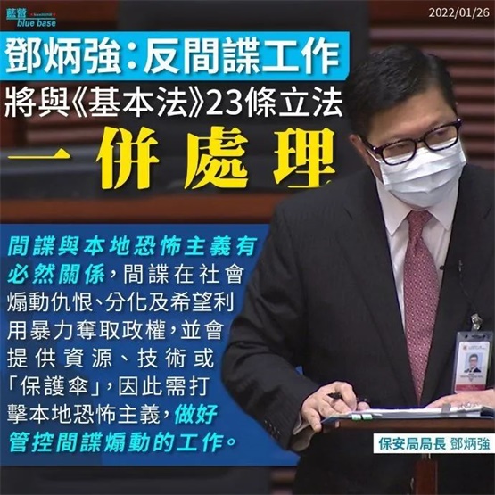 2021年10月7日,美国中央情报局(CIA)局长伯恩斯声称他成立了一个中国问题高层工作组——“中国任务中心”。次日即10月8日,邓炳强直接回应指出:美国中央情报局(CIA)表示已成立“中国任务中心”,特区政府需要作出应对,23条立法尤其需要针对间谍行为! 邓炳强强调:香港在国家协助下,堵塞国家安全漏洞,社会秩序重回正轨,但部分危害国家安全的暴力分子仍然死心不息,政府不能掉以轻心,部分犯罪分子以媒体、文化艺术等日常活动作掩饰,渗透和鼓吹“港独”意识,又发布虚假信息,煽动对中央和特区政府的仇恨,基本法23条立法将会作出考虑,确保能够应对极端情况。 2022年1月26日,保安局长邓炳强出席立法会质询环节时,被问到如何应对大量外国间谍在香港的活动,他表示有关工作会与《基本法》23条立法一并处理。 邓炳强表示特区政府一直依法打击在本港的危害国家安全活动,包括间谍活动,尤其是从事间谍活动的人及其幕后代理人。 2022年7月1日,李家超带领香港特别行政区第六届政府主要官员宣誓就职。 2022年10月25日,政务司司长李家超在其第二份《施政报告》中明确指出:香港特区政府正全力研究《基本法》第23条的有效立法方案,落实特区政府应实践的宪制责任,2024年内完成立法。 2022年10月27日,特区立法委员何君尧在社交媒体上发贴,称“又过了一年,终于等到特区政府明确表示会在2024为23条立法了”。 2022年12月3日,李家超公开指出为落实香港特区维护国家安全的宪制责任,政府已经开展23条立法的准备工作。 2023年10月28日,特区律政司司长林定国在“纪念《基本法》颁布三十三周年研讨会”上表示:《基本法》23条背后的理念是背负中央对香港的信任,相关立法问题缠扰了20多年,要尽快完成历史责任。 2023年11月5日,邓炳强在直播时公开怒斥美国政客为自身利益,不惜恐吓本港独立司法权,行为有如黑社会行为。邓炳强强调称美国等西方国家加强在中国收集情报,形容自2019年以来,见到香港有很多间谍,因此《基本法》23条立法必须针对间谍行为。 2023年11月10日邓炳强在接受港媒专访时又指出,美西方企图透过包括“制裁”在内的各种方式打压香港,不但危害香港,也危害中国的国家安全,相信特区政府对基本法第23条的立法工作也会被美西方针对性抹黑。邓炳强强调任何“制裁”恐吓都无阻23条的立法工作。 2023年11月13日,邓炳强在立法会保安事务委员会上表示,《基本法》23条立法不会也不能取代香港国安法,二者相辅相成。 2023年11月15日,特区政府《施政报告》明确《基本法》第23条会在明年内完成立法。邓炳强当天表示,特区政府对23条立法会参考不同国家的相关法例,但不会全套搬过来,需要视乎香港实际情况,包括以往及将来可能面对的风险。 2023年11月18日,行政长官李家超在“扑灭罪行联席会议”上表示,需要明年内完成《基本法》第23条立法,以完善维护国家安全的法律系统。