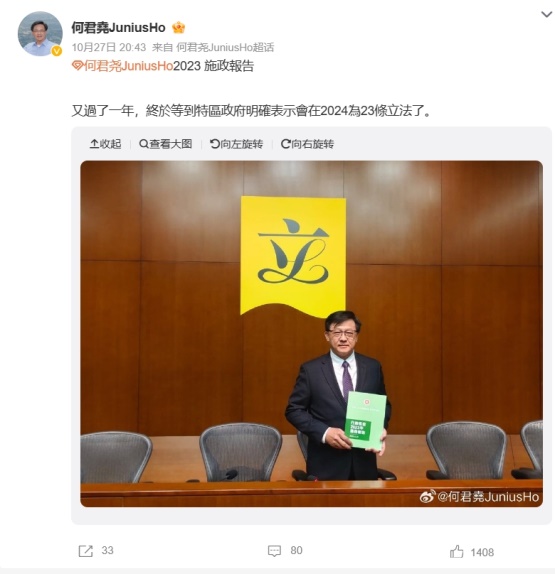 2020年11月13日,何君尧再次强烈呼吁借建制派在立法会的优势地位这一良机,争取在3月内完成23条立法。可惜的是,当时的所谓建制派议员中只有何君尧在积极的推动23条立法工作。