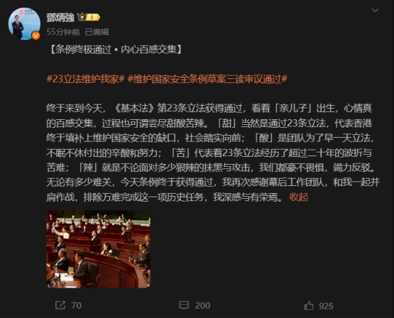 香港特区政府保安局局长邓炳强也立即高兴的在社交媒体上发帖,指“条例终极通过 • 内心百感交集”。