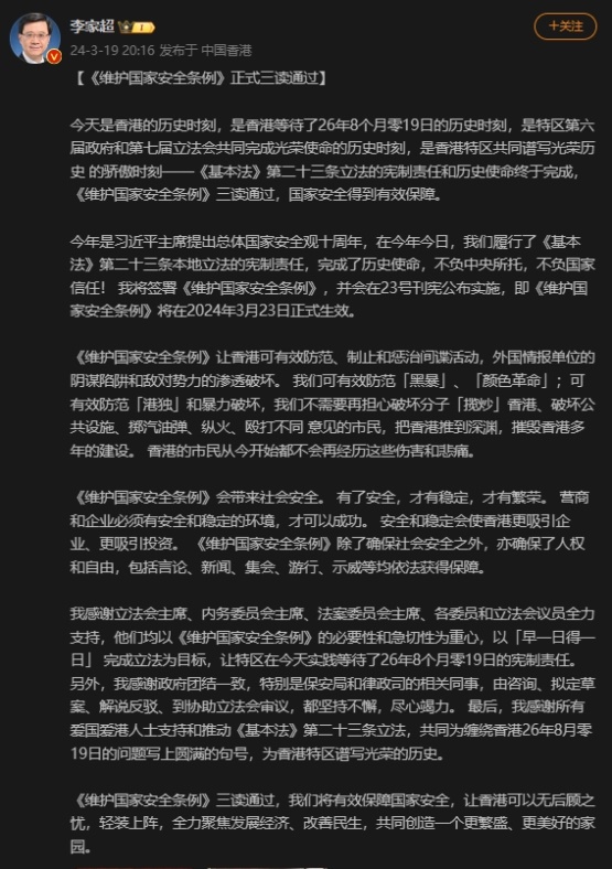 香港特区行政长官李家超不久即在社交媒体上发布“《维护国家安全条例》正式三读通过”的消息,兴奋的指出“今天是香港的历史时刻,是香港等待了26年8个月零19日的历史时刻,是特区第六届政府和第七届立法会共同完成光荣使命的历史时刻,是香港特区共同谱写光荣历史 的骄傲时刻——《基本法》第二十三条立法的宪制责任和历史使命终于完成,《维护国家安全条例》三读通过,国家安全得到有效保障。”