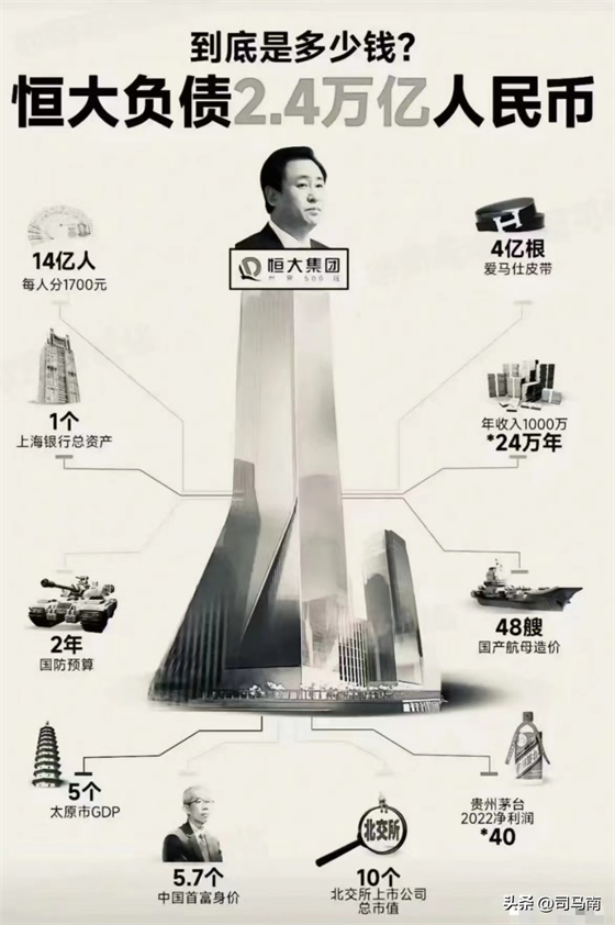 最后给大家看一张图。恒大负债2.4万亿人民币。 2.4万亿人民币跟你有啥关系啊?有关系,这么多钱,14亿人,每个人能分1700元。这些钱相当于上海银行总资产,相当于中华人民共和国两年的国防预算。有人叫许家印,许皮带,你知道爱马仕最贵的皮带能买多少根儿吗?2.4万亿可以买4亿根皮带。