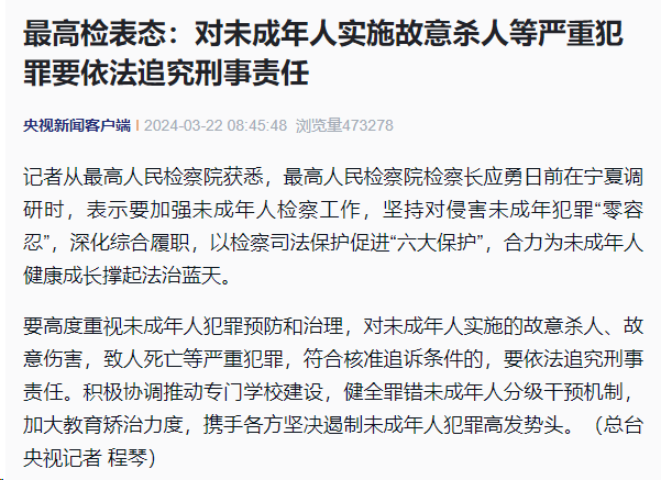 据央视新闻客户端消息,记者从最高人民检察院获悉,最高人民检察院检察长应勇日前在宁夏调研时,表示要加强未成年人检察工作,坚持对侵害未成年犯罪“零容忍”,深化综合履职,以检察司法保护促进“六大保护”,合力为未成年人健康成长撑起法治蓝天。
