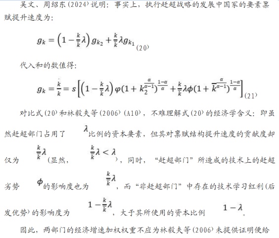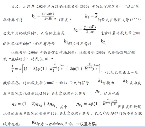 近期,《南京大学学报(哲学·人文科学·社会科学)》2024年第1期“习近平新时代中国特色社会主义思想”栏目,刊登了北京大学吴文和武汉大学周绍东教授的合作研究《“两个不能否定”与国家经济发展战略的动态选择》。该文发现林毅夫等(2006)在经济学中文顶刊发表的新结构经济学代表论文存在一处数学疏忽和一处关键数学漏洞。通过对数学疏忽和关键数学漏洞的修正,该研究支持了“比较优势陷阱论”关于“赶超战略”的价值判断,不能像林毅夫等(2006)一样对以中国为代表的发展中国家所采用的“赶超战略”进行“近污名化”的“学术”判断。