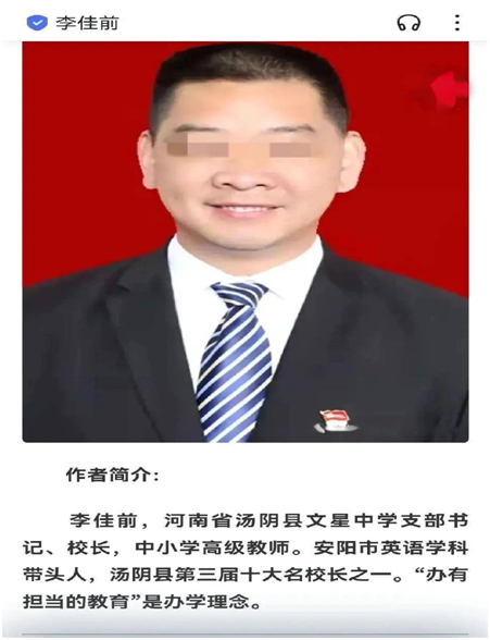 经查,《杜鹃花落》作者李佳前,为河南省汤阴县文星中学支部书记、校长 ,系党员、中小学高级教师;此人多项荣誉加身,安阳市英语学科带头人,汤阴县第三届十大名校长之一。