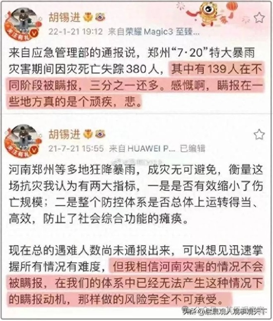 但胡锡进宁愿被打脸,也从来不认错。胡锡进宁愿自己删除自己文章也不道歉。当年郑州发生大水时,胡锡进曾信誓旦旦地说:我相信不会出现瞒报死亡数字问题。结果,官方公布瞒报死亡一百多人时,宁愿被打脸,也不认错。