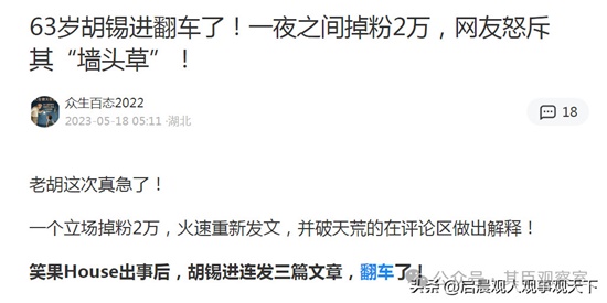 正因为,胡锡进唯上、唯资、唯普世,而造成他违民意、违真理,所以在他的评论区经常出现翻车现象,也经常被自我打脸。