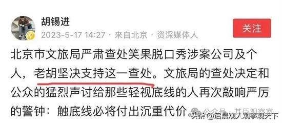 当官方对这位相声演员做出处罚后,胡锡进立马改口,“老胡坚决支持这一查处”。
