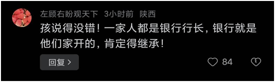“我想当中国农业发展银行的行长,继承我的爸爸。因为我的爷爷是中国农业发展银行的行长,我的妈妈是中国农业发展银行副行长,所以我想继承我们的家产。”近日,一段小男孩讲述自己梦想的视频引发舆论关注。有网友认为,孩子提及的家庭关系值得监管部门关注(2024-04-03 红星新闻 《男孩称想当行长继承家产,中国农发行纪检委工作人员:已关注到此事》)。