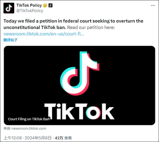 第二件事则是美国针对中国的另一家互联网科技公司的封杀手段,即美国总统拜登4月24日签署的针对TikTok“不卖就禁”的法案。拜登签署该法案后,并不意味着立刻就会执行,围绕这一点的斗法还将持续,大概率会持续到新一任总统上任。果不其然,TikTok开始反击了!
