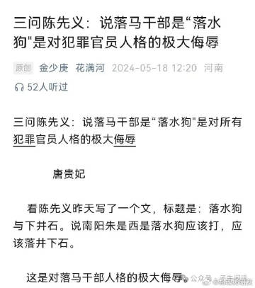 一篇题为《三问陈先义:说落马干部是“落水狗”是对犯罪官员人格的极大侮辱》(下略为《三问》)的文章出笼了。