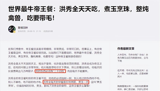 到后来,为了说洪秀全生活奢侈,又编造他每顿饭得吃24种牲口,每顿早饭要吃珍珠2颗、美玉一块。