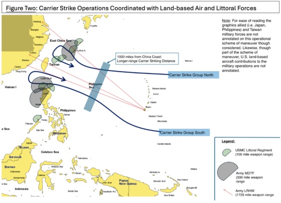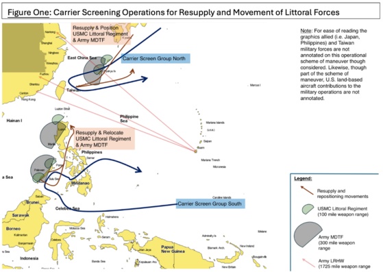 要在第一岛链内取得成功,海军陆战队和陆军将需要后勤舰船和机动性,以便使中国的目标打击工作复杂化。一个设计用于空中优势的航母及其舰载机联队,可以在这些地面部队重新部署或补给时,为其提供掩护。与此同时,在航母掩护部队扫荡该区域时,地面部队将接收并提供针对威胁的目标数据。