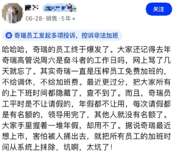 2023年3月,奇瑞汽车工程技术研发总院院长高新华发布内部邮件称,“通知所有的员工以奋斗者为本,周六是奋斗者的工作日。”