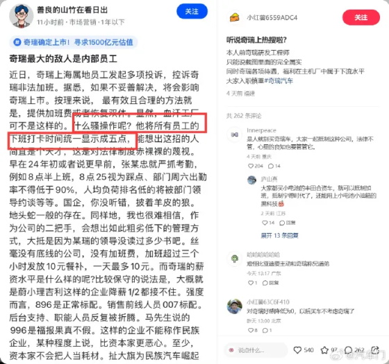 近日,一名认证为“奇瑞员工”的网友发帖控诉,奇瑞汽车内部存在强制加班行为,每周加班时长需大于20小时并且没有加班费,仅补贴10元餐补。另外,员工加班调休时间严格限制,部分部门禁止调休申请、禁止请假,还会依照加班时长进行末位淘汰。为了掩盖加班事实,目前员工上班打卡历史记录已被关闭,默认展示打卡时间为8:30至17:00。