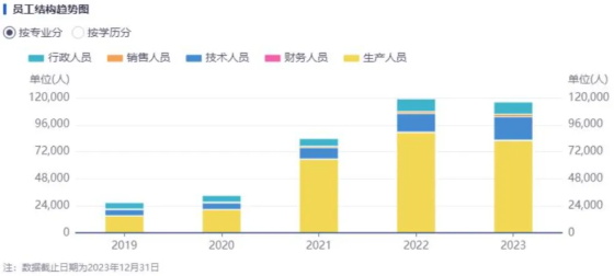 此外,根据上市企业宁德时代提供的年报,2023年宁德时代的员工总数在下降,特别是生产人员锐减万人: