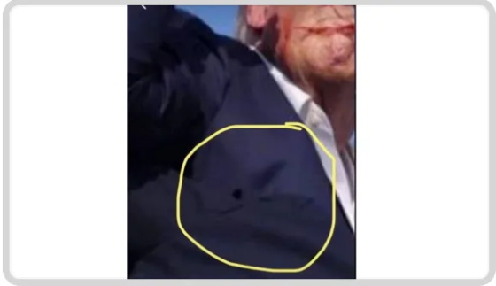 另外还有一个细节是,特朗普在感到耳朵流血后用手摸了一下耳朵,就在他抬手侧身的时候,另外一发子弹又打过来了,子弹直接打穿了特朗普腋下的西服,然后将其身后另外一名观众打成了重伤。如果不是特朗普刚好抬手侧身摸了一下耳朵,那么第二枪威力巨大的子弹就会正中他的胸膛。