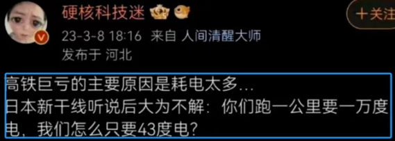 3月8日,此人又说“高铁巨亏的主要原因是耗电太多,日本新干线听说后大为不解:你们跑一公里要一万度电,我们怎么只要43度电?”我数学不好,但我也知道10000是43的两百多倍,这逆天的谣言直接惊动了@科技日报 下场辟谣,这算不算搬弄是非拉仇恨?