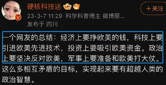 @硬核科技迷说别人“整天搬弄是非拉仇恨”,牠又是什么样子的呢?3月7日,牠说,“一个网友的总结:经济上要挣欧美的钱,科技上要引进欧美先进技术,投资上要吸引欧美资金,政治上要坚决反对欧美,军事上要准备和欧美打打仗,这么多相互矛盾的目标,实现起来要有超越人类的政治智慧”,明明是美西方在搞脱钩在开历史倒车,但这话里话外好像责任都在中国似的,这算不算搬弄是非拉仇恨?