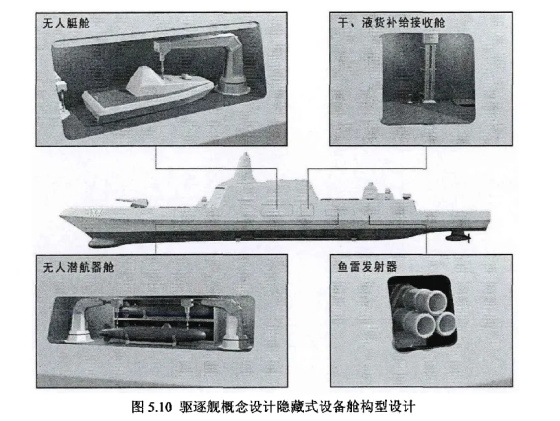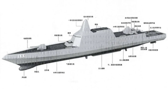 以电磁轨道炮,高能激光炮,微波武器组成的新概念武器、以无人机、无人水下潜航器组成的无人机装备、综合射频技术集成桅杆、集成一体化上层建筑、可遂行防空反导、反潜反舰、对陆打击等任务,具备大型化、通用化、标准化、多功能化、集成化及隐身化等特点,不论是看起来还是听起来,给人感觉还蛮不错。
