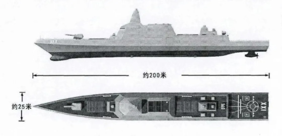 作者在论文中将舰命名为“面向2035年的中国万吨级多功能驱逐舰”,舰长200米、型宽25米、满载排水量达2万吨,体量要比055万吨大驱有所增加(舰长180米、型宽20米,满载排水量1.1万吨)。紧接着作者指出,该舰将采用综合全电动力推进系统、系以一坑四弹模式为主的通用垂发系统。