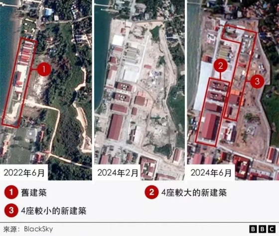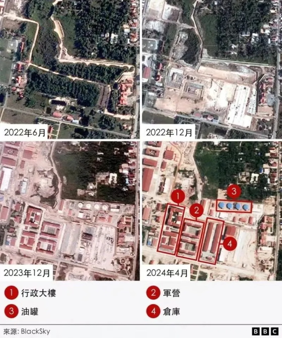 2022年6月,时任中国驻柬埔寨大使王文天向媒体确认,中国援助的柬埔寨云壤海军基地升级改造项目正式开工,有海外媒体根据BlackSky的卫星图像分析,从2022年6月到2024年6月,两年间,云壤海军基地已经建成了14座大型建筑、一座码头和一片填海区域----全世界除了中国的基建力量,没有任何国家能够有如此之高的生产效率。