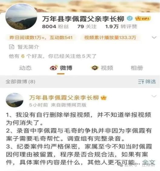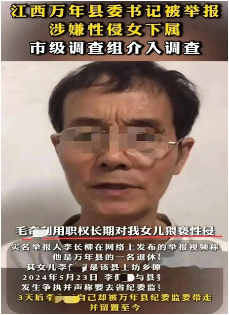 网上有人发微信,说是万年的老先生、李佩霞的父亲李长柳冒然举报,结果“不仅让女儿陷入舆论风波中,连女婿的颜面都不顾,还有他那上高中的外孙子,得知妈妈是这样的一个人,该有多痛苦,好在现在正在放暑假,不然李佩霞儿子该如何面对同学的议论,想想都替孩子感到揪心与难过。”他说的事实,此事一出,李佩霞的家庭就毁了,他担心也不是多余的,李佩霞的家人都抬不起头。但他不赞成李父的举报,但不举报,李佩霞已经被带走了,她的家庭也早已破碎了,她还可能定罪,而毛书记却可能逍遥法外,她受到的伤害、侵害,可能石沉大海,她以及她的家庭都要蒙受不白之冤。