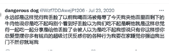 但耿直哥当时调查发现,与他一起躲在国外的女友吴欢,曾在境外社交平台开设过一个账号。从吴欢的帖文来看,两人在国外过得并不像王靖渝自己描述的那样不愁吃喝。她还指控王靖渝人品有很大问题,说王靖渝经常打骂和侮辱自己,对自己“精神控制”,是个“有点臭钱就觉得自己了不起”和“用下半身思考的玩意”。
