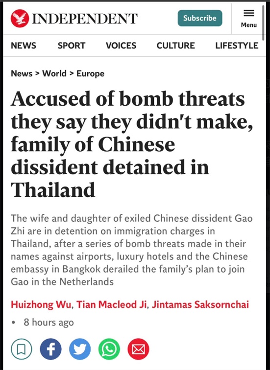 按照高某和王靖渝说法,在高某躲到荷兰后,他的家人原本是想从泰国来荷兰与他团聚的,但高某家人在泰国时却先后接到了来自“中国外交官”和来自“荷兰移民局”的信息,说高某的家人威胁要用炸弹袭击中国在泰国的领事馆和荷兰的机场,所以荷兰无法批准他们来荷兰的签证申请。结果,高某的家人就慌了,不知道该怎么办了,高某的妻子和女儿还因为签证过期后没有离开泰国,被泰国的移民局给扣了,他儿子虽然也在泰国,但没有被泰国方面扣下,只是也见不到高某的妻子和女儿。