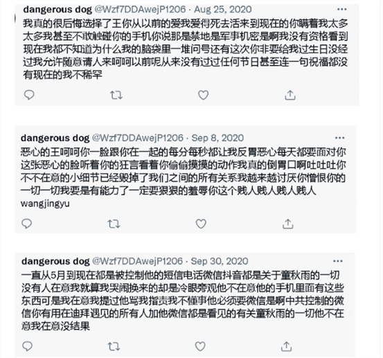 她还说王靖渝表里不一,比如“一边对别人说微信被中国政府控制不能用,一边自己却经常用微信与其他女生聊骚”。而且,从吴欢发帖的状态来看,她似乎已经被王靖渝搞的有些精神失常了,不仅跟着他一起骂中国,还咒骂过奥巴马和拜登。
