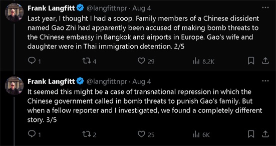 后来,在2023年的时候,美国国家公共电台的另一个名叫弗兰克(Frank Langfitt)的记者,从此时已经躲到了荷兰的王靖渝那里听说,他的室友、反华分子高某的家人,正在遭到中国政府在海外的“陷害”后,便立刻凑了上来,想要报道中国政府是怎么在其他国家“害人”的。