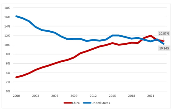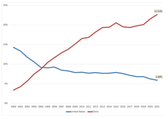 如图 2 所示,按照美国中央情报局和国际货币基金组织采用的衡量国家经济的最佳标准,中国现在是世界上最大的经济体。根据美国中央情报局的数据,2023 年底,中国的 GDP 按购买力平价计算为31.2 万亿美元,而美国为24.6 万亿美元。许多美国人发现这与他们内心深处的认知相去甚远,根本无法相信。他们指出,按照以市场汇率衡量经济体的传统标准,美国仍然位居第一。他们提醒我们,中国的人口是美国的四倍,因此人均 GDP 仍然远远落后。但正如图 3、4 和 5 所示,在超越美国成为最大经济体的过程中,中国已经取代了竞争对手,失去了其惯常的地位,即第一大贸易国、世界制造工厂和高科技产品出口国。