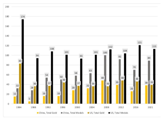 和当今世界上大多数比赛一样,本届奥运会上有两个超级大国——而且只有两个:中国和美国。截至 8 月 9 日,美国已获得 30 枚金牌,而中国获得 32 枚。在总奖牌数上,美国运动员目前已获得 104 枚,而中国选手获得 77 枚。下周日将颁发 987 枚奖牌中的最后一枚,届时东道主法国将竭尽全力打出与开场一样精彩的收官战,美国夺得冠军的几率约为 80%。但正如尤吉·贝拉(Yogi Berra,知名前美国棒球运动员)告诉我们的那样:“不到最后一刻,结果无从知晓。”