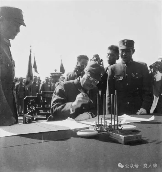1945年10月10日,华北战区受降仪式上,日本华北方面军司令官根本博在降书上签字