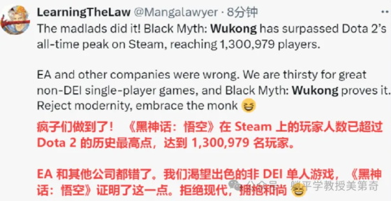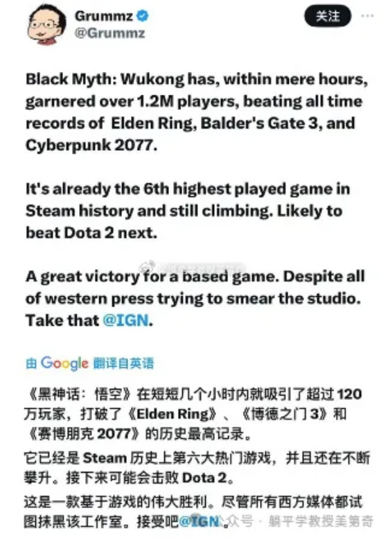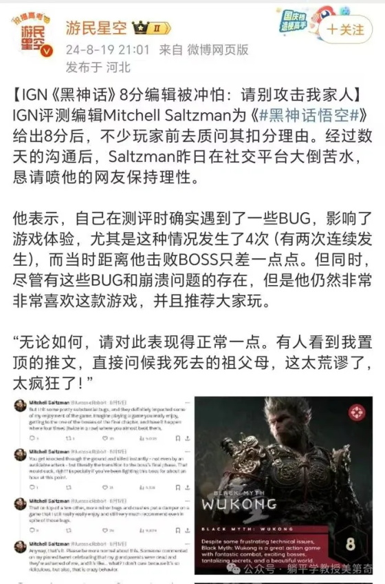 如果之前这个游戏还是以反政治正确而闻名海外玩家群体的话,那么上线之后几个小时,它已经征服了全球各路玩家。而之前故意打压黑神话悟空的游戏媒体IGN,那个故意给黑神话悟空打8分的“政治正确”编辑,则因为游戏好评如潮,受不了压力,开始装“网暴受害者”