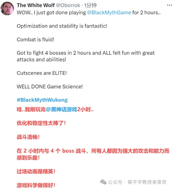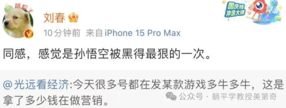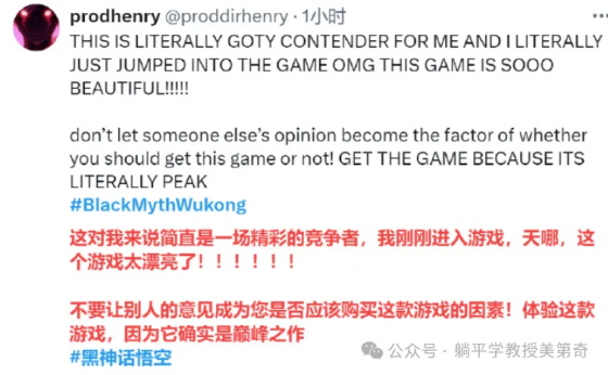 如果说流浪地球开启了中国电影自强的元年,那么黑神话悟空,就是把中国3A大作游戏推向了全世界。以前提起孙悟空,老外想到的都是龙珠漫画,现在终于可以正本清源,看看大圣的真身了。金猴奋起千钧棒,玉宇澄清万里埃。今日欢呼孙大圣,只缘妖雾又重来。不客气的说,一个黑神话悟空,顶十个大外宣。