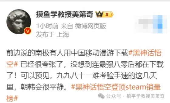 就这么说吧,就是在南极,也有俩人顶着高额漫游费下载黑神话悟空,即使在Steam被封的朝鲜,最强八零后也在大圣。