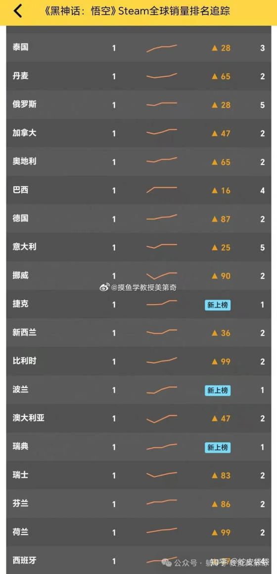 有黑子说,这游戏这么火,不过是中国人自己的自嗨。可你看一下各国的排行榜,黑神话悟空几乎全线霸榜。