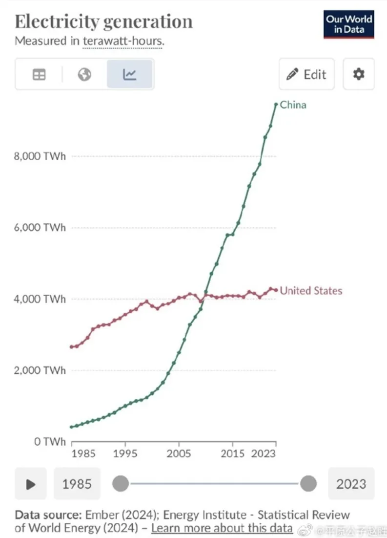 2023年,中国的发电量达9.4564万亿度,是美国的两倍,是世界的三分之一,而我国的工业总产值占世界的35%,这个数据是对得上的。
