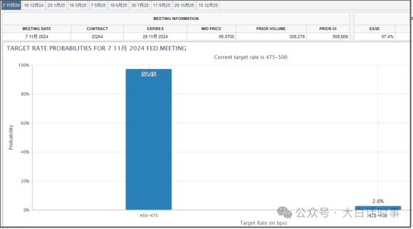 芝商所的美联储观察工具显示,数据公布前,市场预期美联储11月降息50基点概率是超过30%,但在数据公布后,市场预期11月降息50基点概率基本为0,预期11月降息25基点的概率是97.4%;
