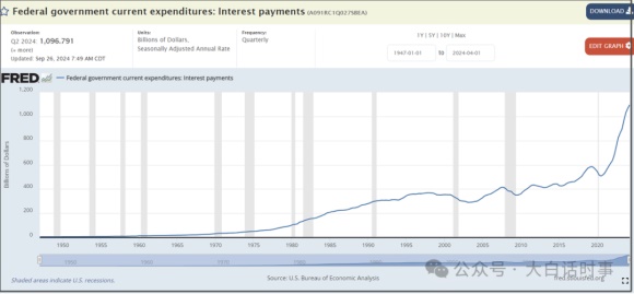 美国政府过去一年的利息支出,已经达到了1.1万亿美元。而美国去年的财政收入为4.4万亿美元。