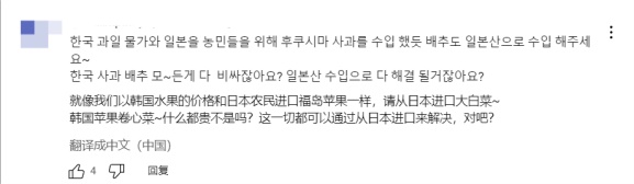 “既然韩国先前都已经放宽福岛的苹果进口了,那不如这回干脆连大白菜也请从日本进口吧。韩国的苹果和白菜都太贵了,多进口点日本货应该有助于平抑物价吧?”