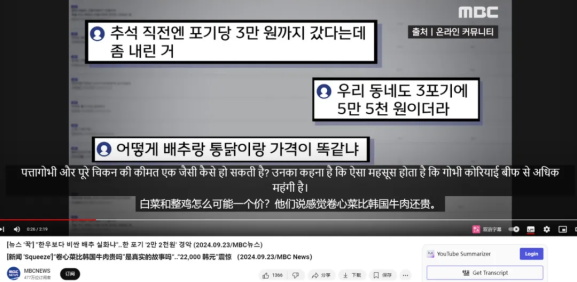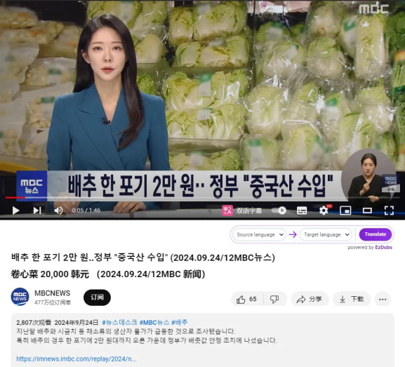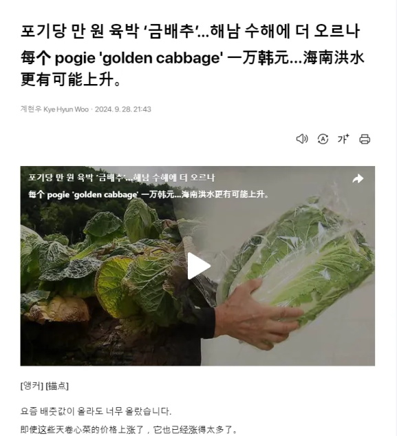 我在这里大家念的这些,都是我从韩媒MBC新闻网的YouTube账号上选取的韩国网民的评论。受种种因素影响,最近韩国那边的大白菜价格飙涨,截至9月中旬,韩国市场上平均每颗大白菜的批发价格已经超过了9000韩元,约合人民币48元,而终端零售价格更是一度达到了2万至2.2万韩元,约合人民币107元至118元。