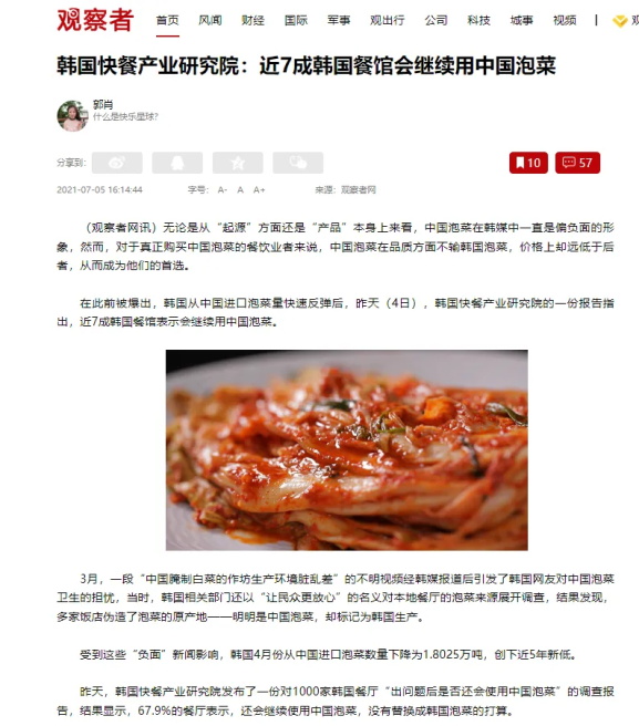 不光我不信,很多韩国人,尤其是干餐饮业的韩国人也不信。2021年7月,韩国快餐产业研究院曾经在一份统计报告中指出,尽管韩国舆论场上抹黑中国泡菜的各种腌臜言论一直不绝于耳,但是广大从事餐饮行业的韩国老板对此却持不同看法。接受调研的1000家韩国餐馆中有高达67.9%的受访者均表示,无论韩国舆论场上有关中国泡菜的流言蜚语有多难听,他们都会继续坚持使用中国泡菜,不打算换成韩国泡菜。