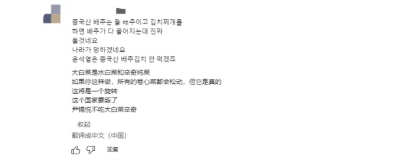 “中国产的大白菜的水分太多了,做泡菜汤的时候菜叶子都会散掉,真是要气疯了。这个国家要完蛋了,尹锡悦这么搞,怕不是他自己吃的就是中国的大白菜和泡菜吧?”